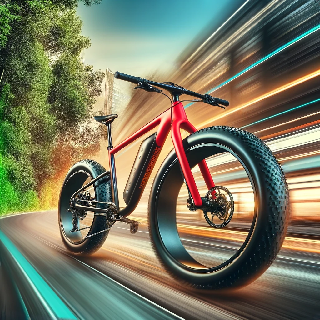 DALL·E 2024-04-29 20.44.02 - Dynamic image of a MATE.BIKE signature model in motion, equipped with ultra-wide rims and fat tires, all in red color. The bike is displayed in a vibr