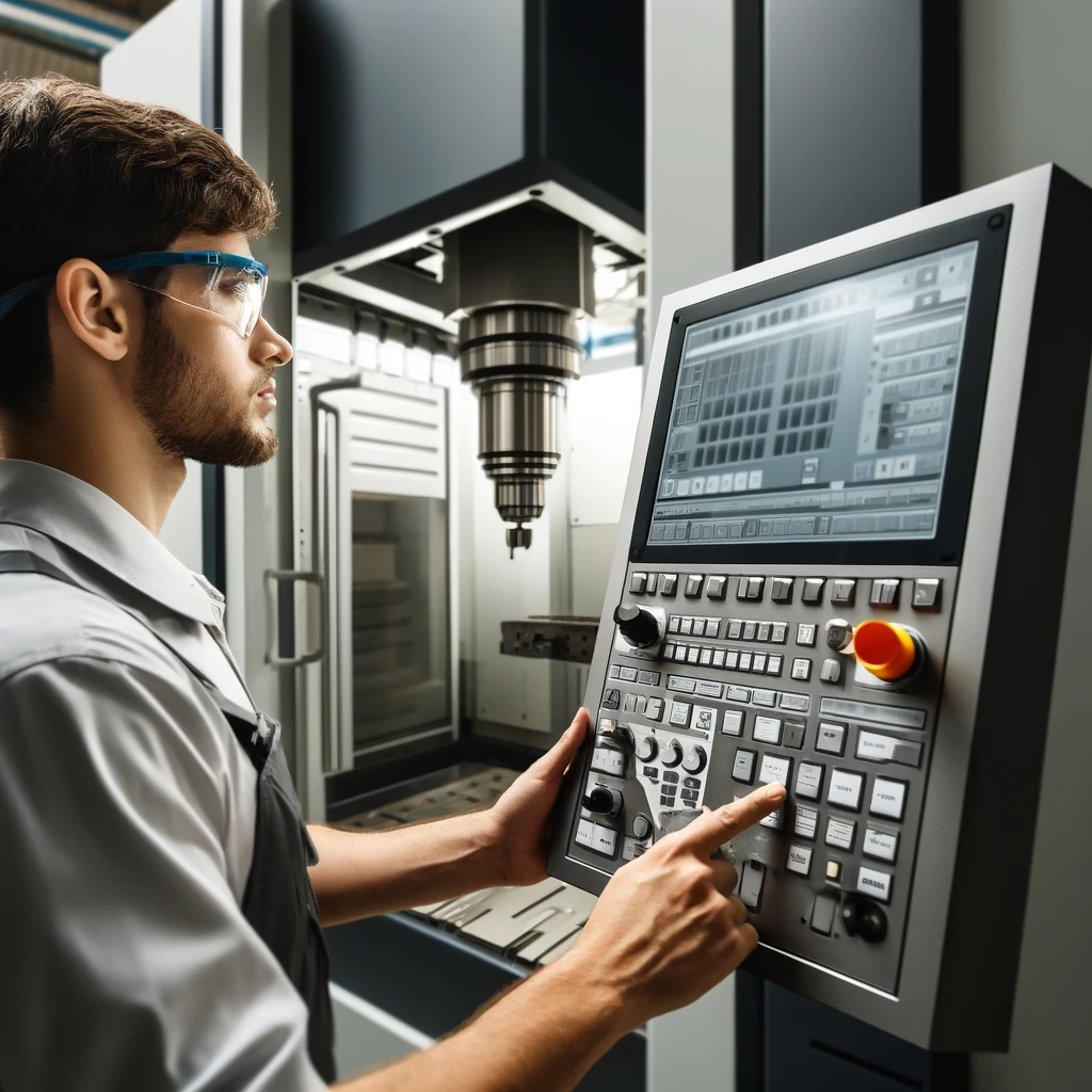DALL·E 2024-05-15 09.08.14 - A close-up of a high-tech CNC drilling center being inspected by a technician. The technician is wearing safety glasses and a uniform, focusing on the