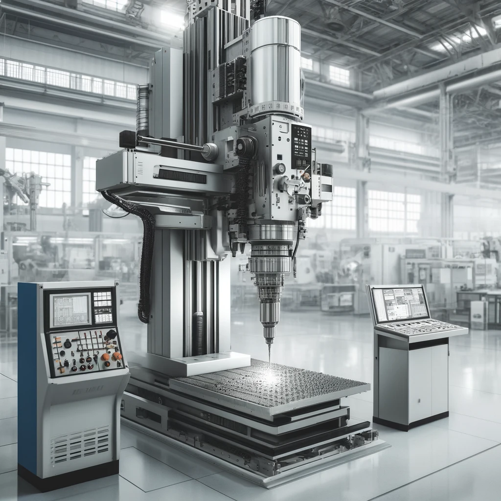 DALL·E 2024-05-15 09.11.13 - A modern industrial drilling machine in a factory setting. The machine is large and sophisticated, with various controls and a robotic arm. The backgr