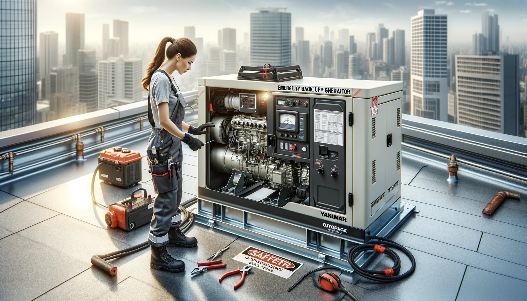 DALL·E 2024-05-15 10.04.10 - An emergency backup generator system on a building rooftop. A professional female technician is working on the generator, which is similar to the Yanm