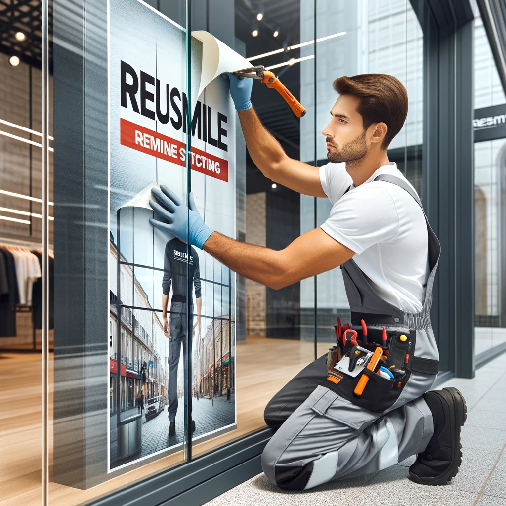 DALL·E 2024-05-24 21.35.02 - A worker from ReuSmile carefully peeling off a large window sticker from a storefront. The scene shows the worker using specialized tools to gently re