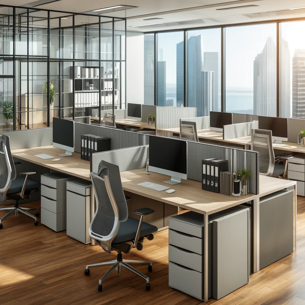 DALL·E 2024-05-31 15.05.58 - A modern office space with ergonomic desks and chairs, cabinets, and partitions, all in excellent condition 2024年5月31日 Twitter Share Pocket Hatena LINE コピーする Twitter Share Pocket Hatena LINE コピーする -