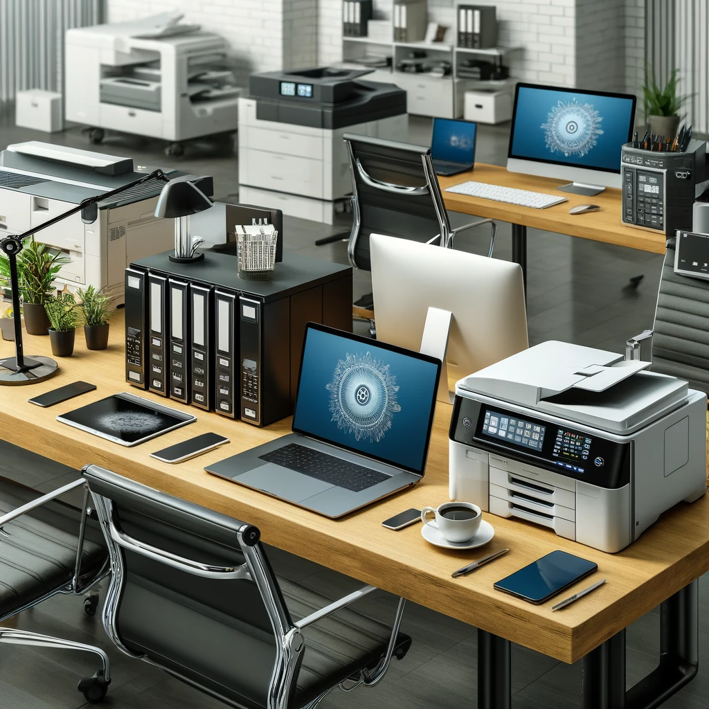 DALL·E 2024-05-31 15.06.08 - Office equipment including high-end laptops, printers, multifunctional devices, and projectors in a professional office setting