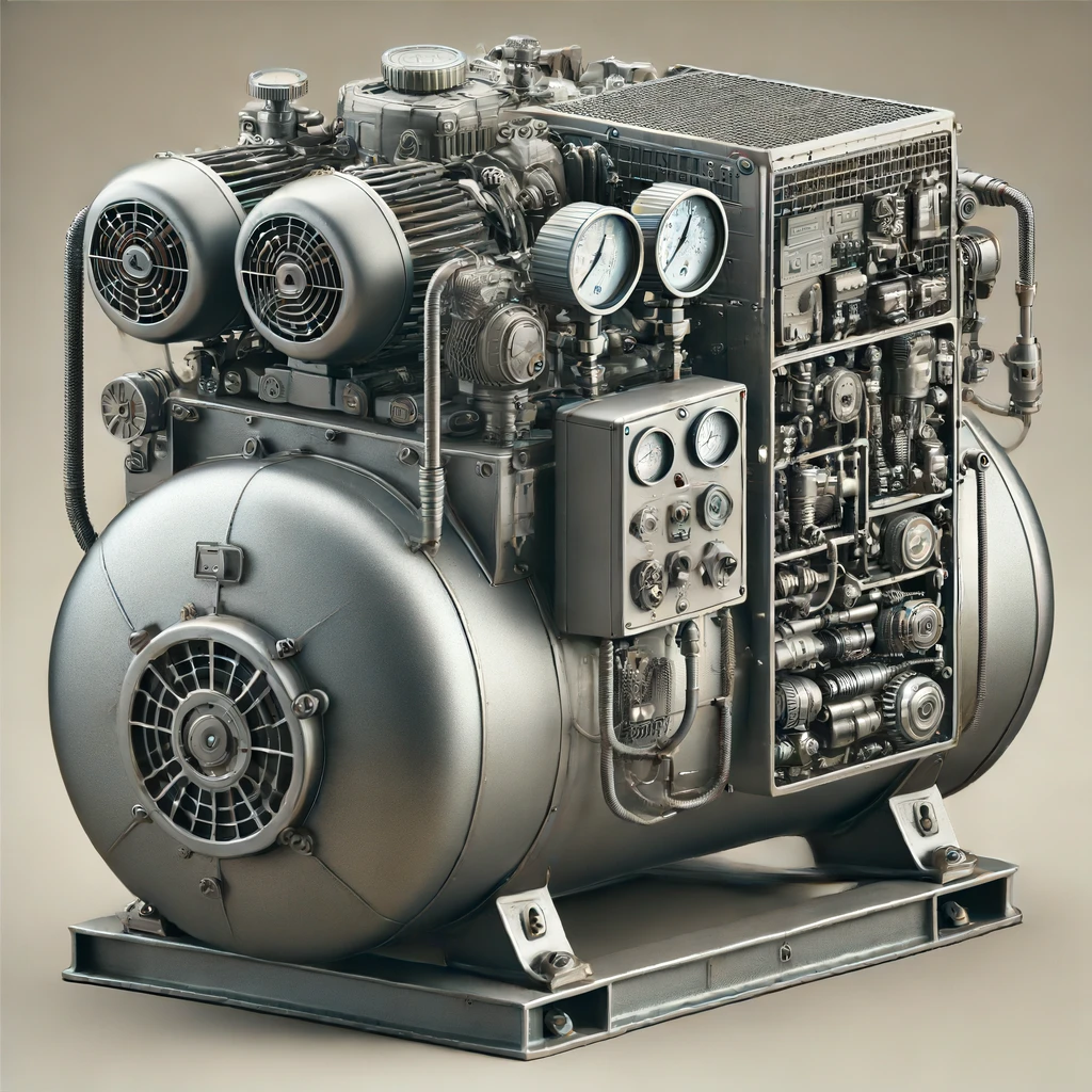 DALL·E 2024-06-16 21.50.02 - A detailed image of a large industrial air compressor with robust metal housing, multiple pressure gauges, hoses, and an industrial look. The compress