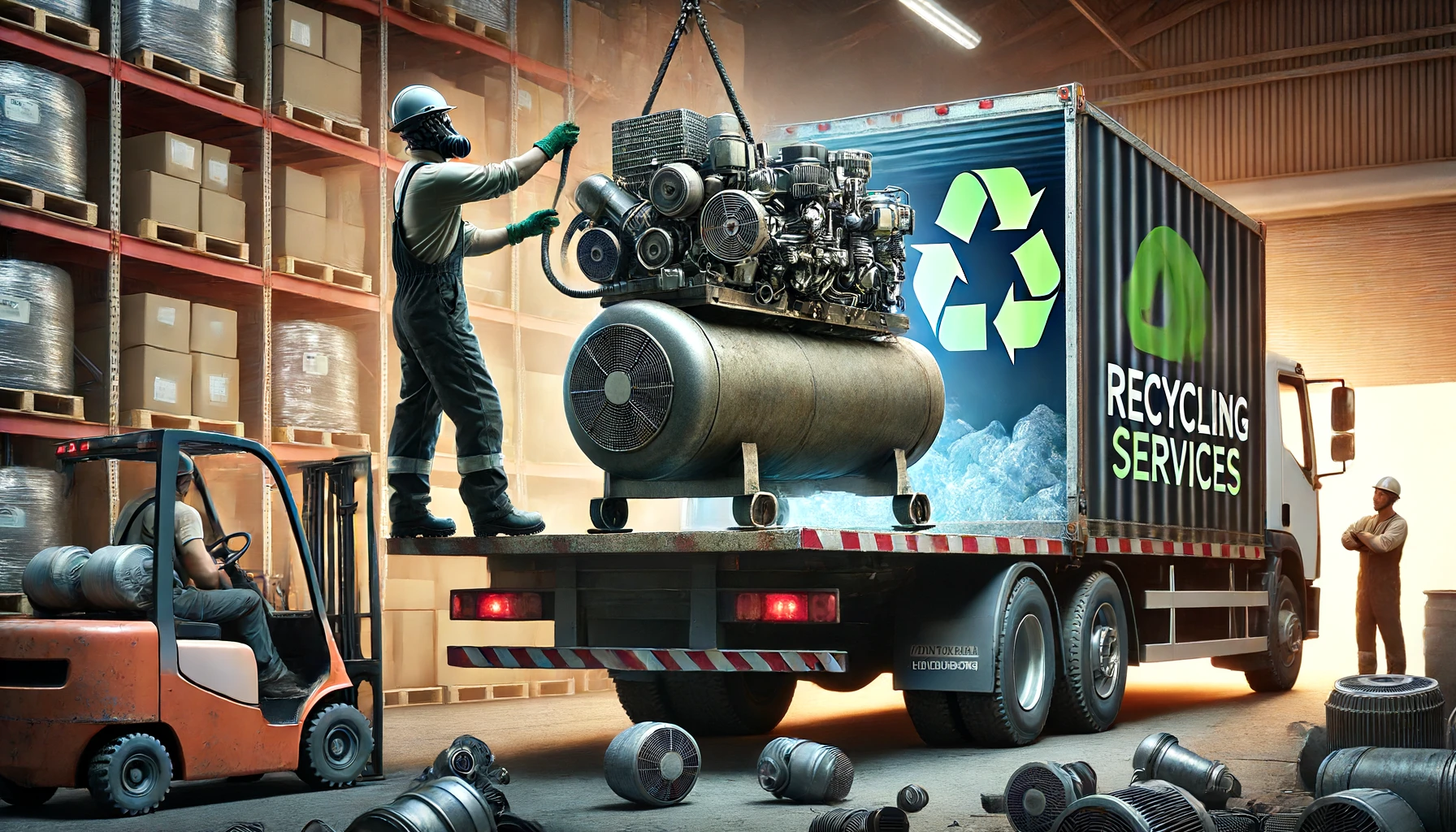 DALL·E 2024-06-16 21.52.33 - An image showing a used industrial air compressor being loaded onto a truck for recycling or disposal. The scene should depict workers carefully handl