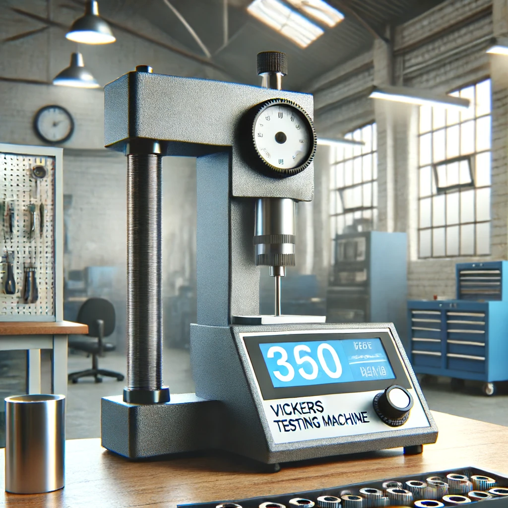DALL·E 2024-06-18 22.20.47 - An image depicting the process of measuring hardness using a Vickers hardness testing machine in an industrial setting. The machine is sleek and moder