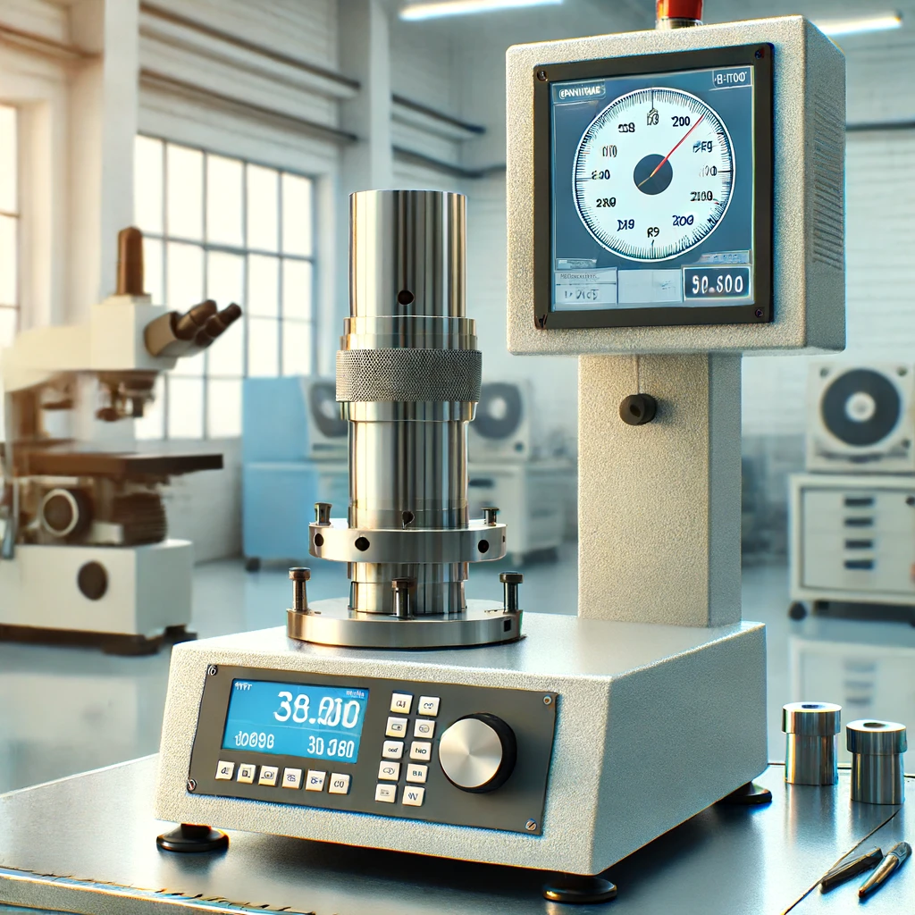 DALL·E 2024-06-18 22.20.50 - An image showing a roundness measuring machine in operation. The machine has a cylindrical object placed in it, and the digital display shows the roun