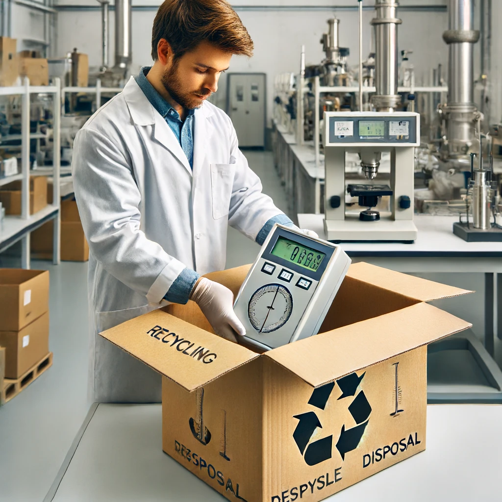 DALL·E 2024-06-18 22.20.56 - An image showing a technician in a clean and organized industrial laboratory, preparing a measuring device for disposal. The technician is carefully p