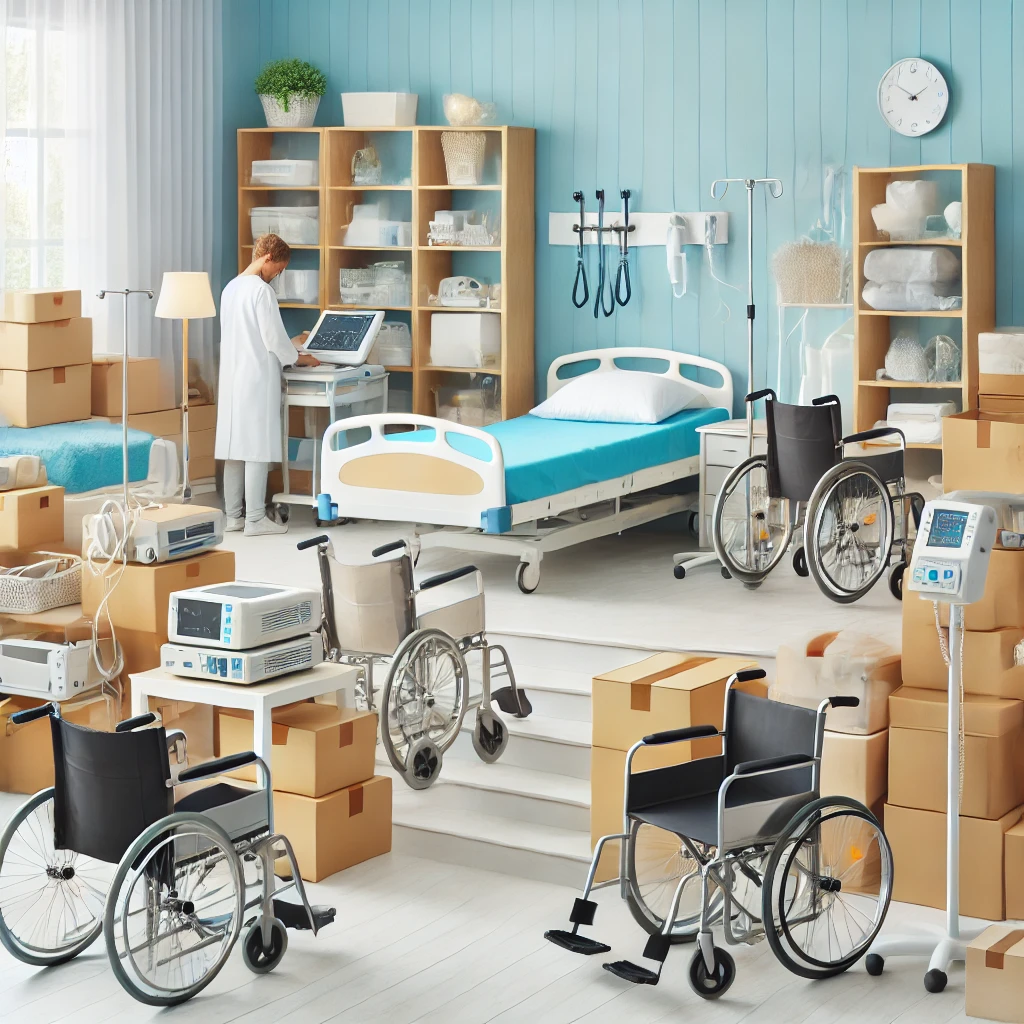 DALL·E 2024-06-21 16.06.02 - A bright and organized interior of a care facility showing various pieces of medical equipment and furniture, such as electric beds and wheelchairs, b
