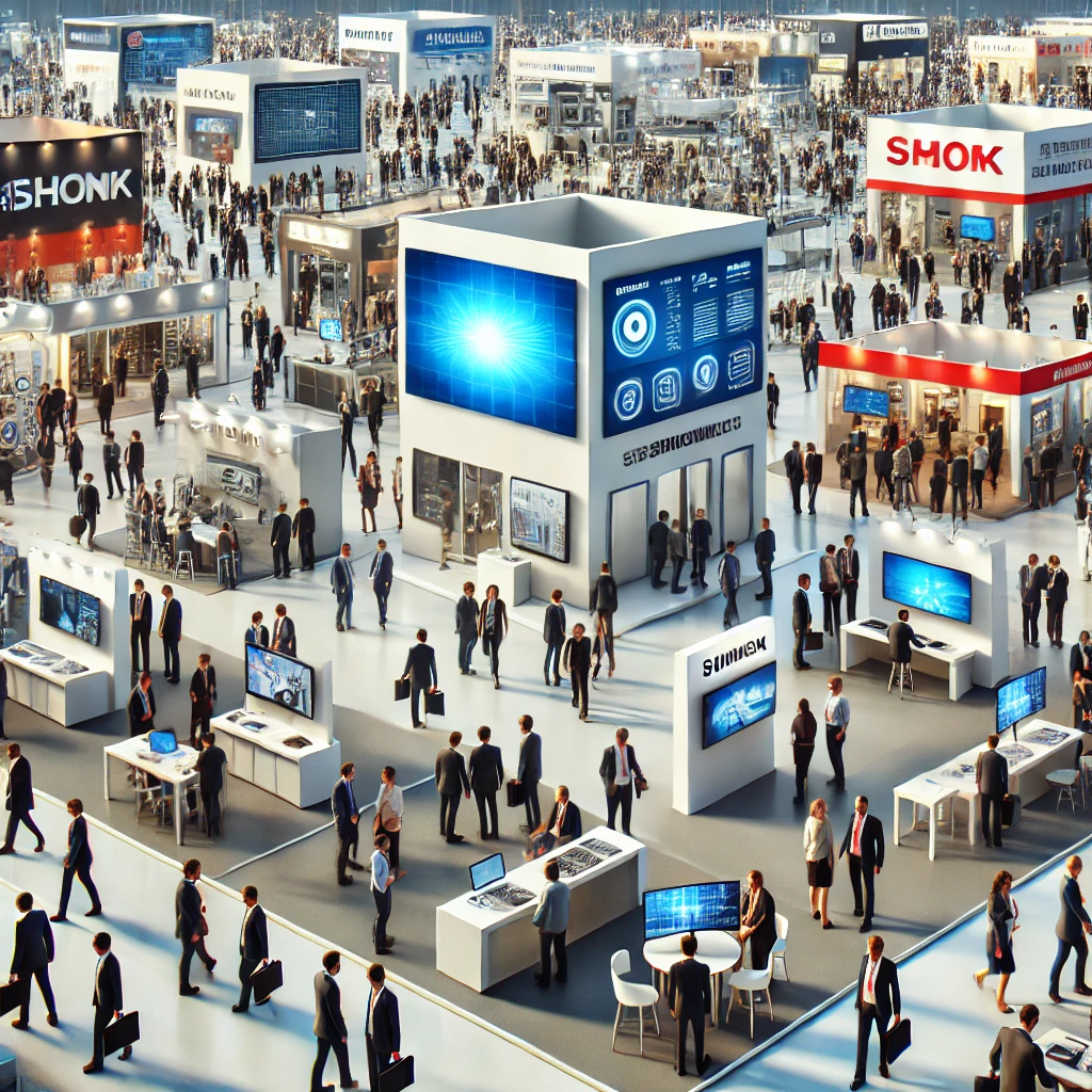 DALL·E 2024-08-03 12.07.31 - A trade show scene with multiple exhibition booths, interactive displays, and crowds of attendees. People are networking, sharing information, and exp