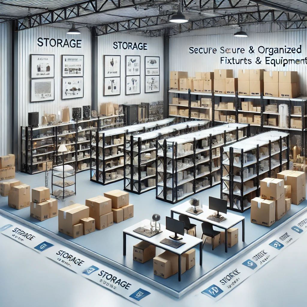 DALL·E 2024-08-10 12.38.04 - A secure and organized storage facility with neatly arranged exhibition fixtures and equipment. The storage area includes various items such as displa