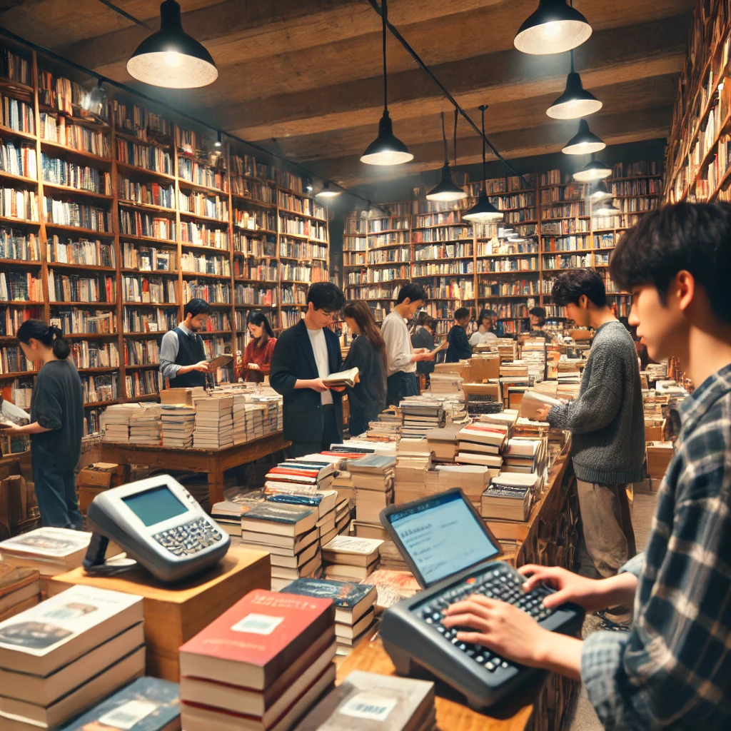 DALL·E 2024-08-04 21.48.09 - A bustling used bookstore with people browsing shelves full of second-hand books. The environment is warm and inviting, with wooden shelves, cozy ligh