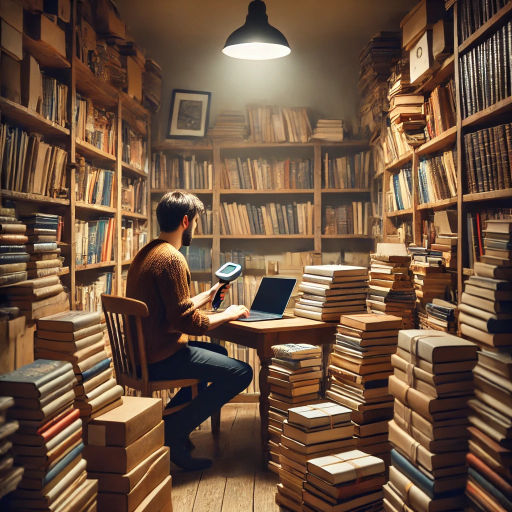DALL·E 2024-08-04 21.52.40 - A cozy corner of a used bookstore with a person seated at a table, surrounded by stacks of second-hand books. The person is using a barcode scanner an