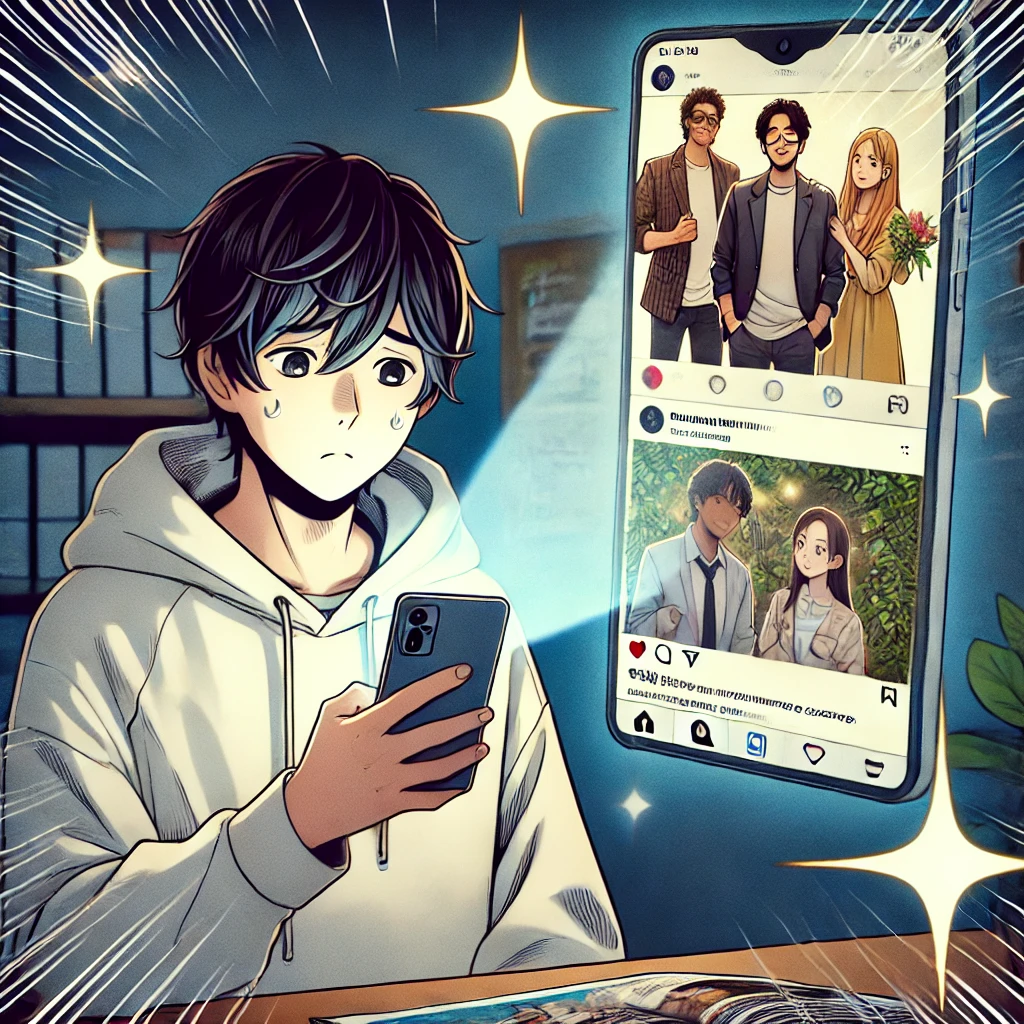 DALL·E 2024-08-16 14.22.52 - Create a manga-style image depicting the theme of comparing oneself to others' success. The image should show a character looking at their phone with
