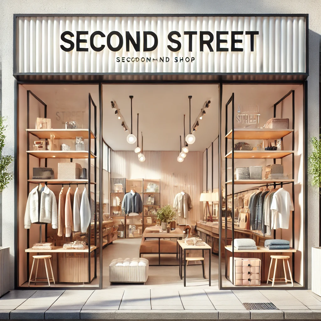 DALL·E 2025-01-07 11.42.51 - A modern and clean storefront of a second-hand shop inspired by the style of Second Street. The store features a large glass facade with neatly arrang
