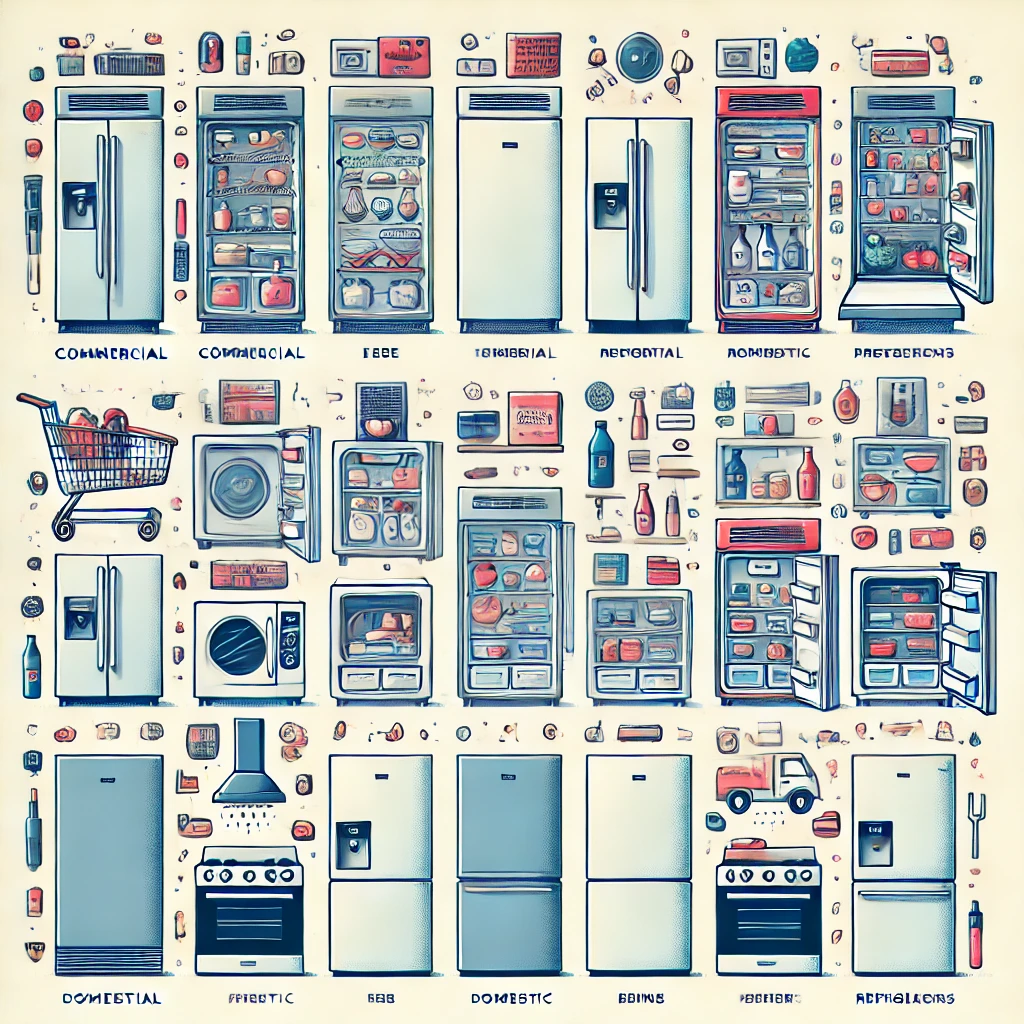 DALL·E 2024-10-06 18.39.25 - An image illustrating the difference between commercial and domestic refrigerators, showcasing various sizes and models, highlighting the different us