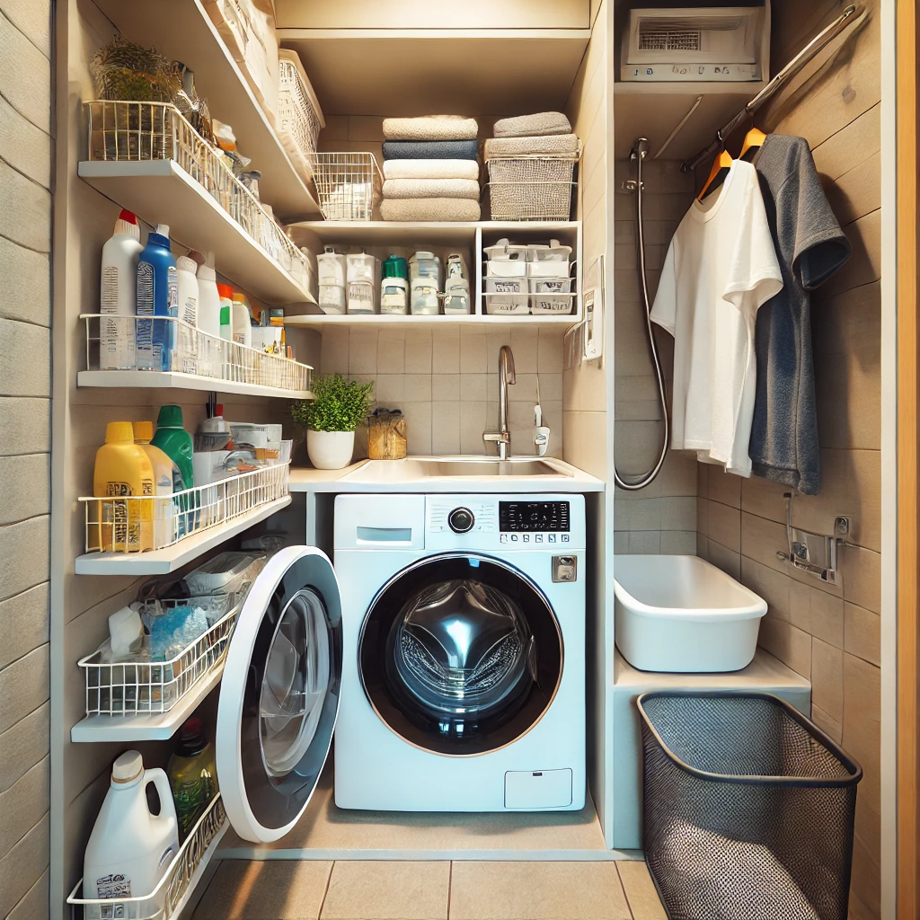 DALL·E 2024-10-23 18.33.41 - A compact, efficient laundry room in a small apartment, featuring a modern front-loading washing machine. The space is well-organized with floating sh