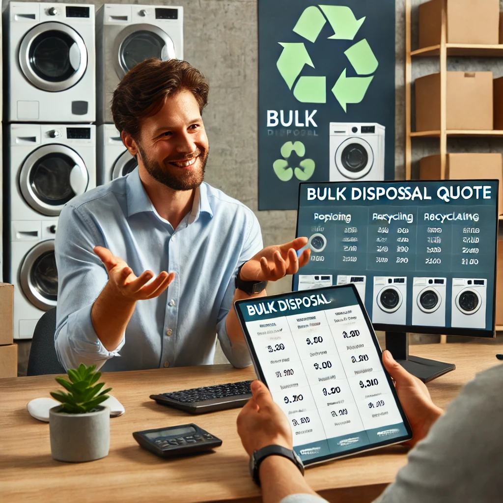 DALL·E 2024-10-23 18.40.20 - A customer talking to a service provider about a bulk disposal quote for washing machines. The setting is a modern office with the provider showing pr
