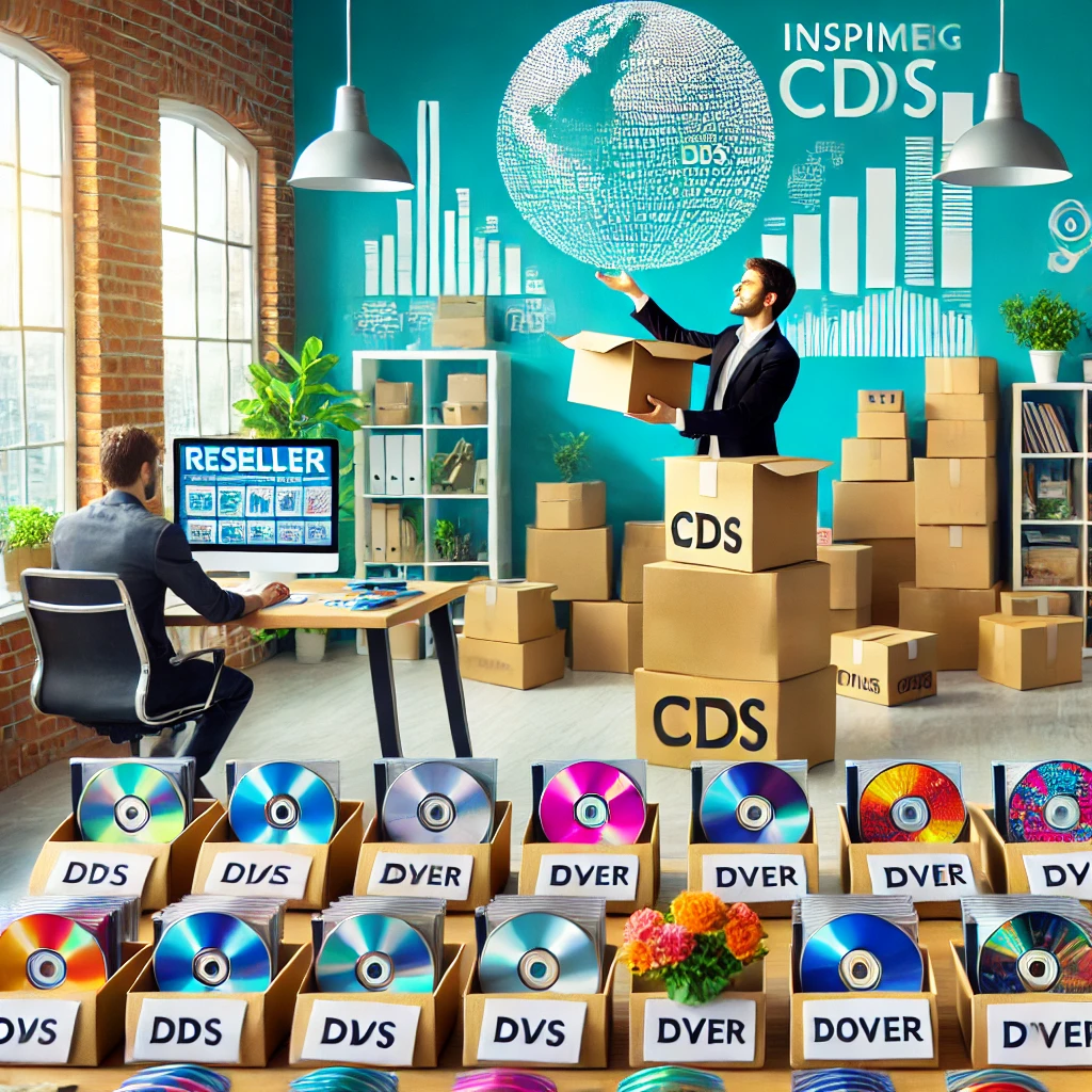 DALL·E 2024-11-24 16.52.41 - An inspiring image of a successful reseller packaging CDs for shipment, with neatly labeled boxes ready for delivery, in a vibrant and organized works