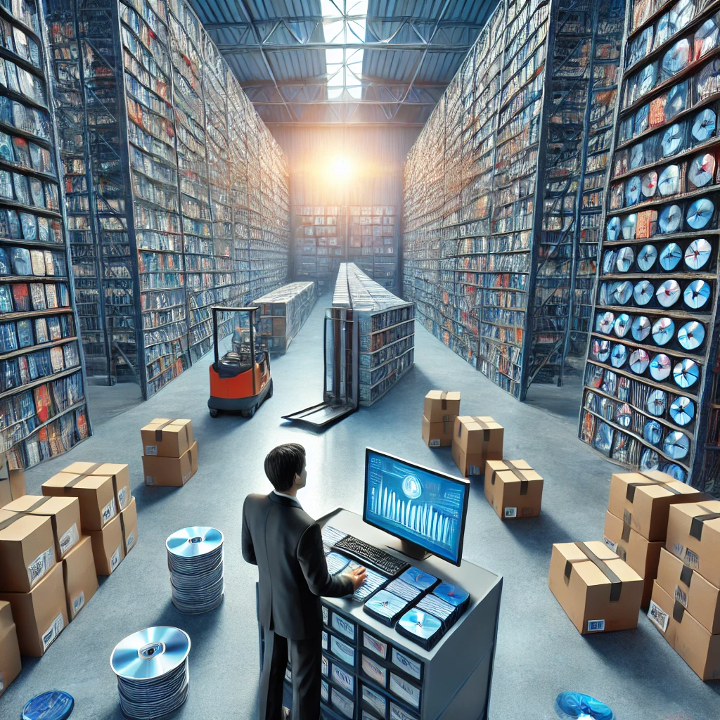 DALL·E 2024-11-24 16.59.25 - A visually appealing image of a well-organized CD wholesale warehouse with neatly stacked shelves filled with CDs, a visible sign of ongoing supply av