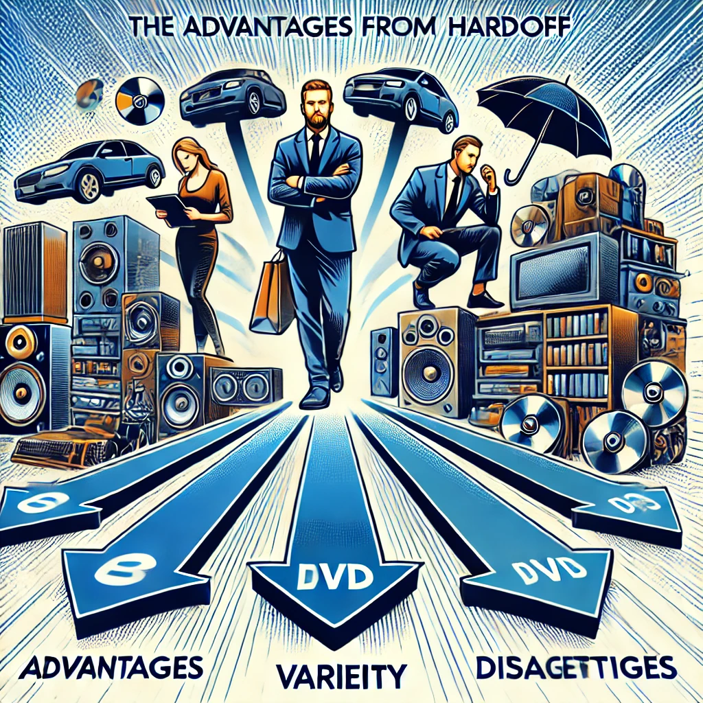 DALL·E 2024-11-24 17.24.42 - A dynamic illustration showing the advantages and disadvantages of sourcing from HardOff, including a shopper inspecting electronics and DVDs in a bus