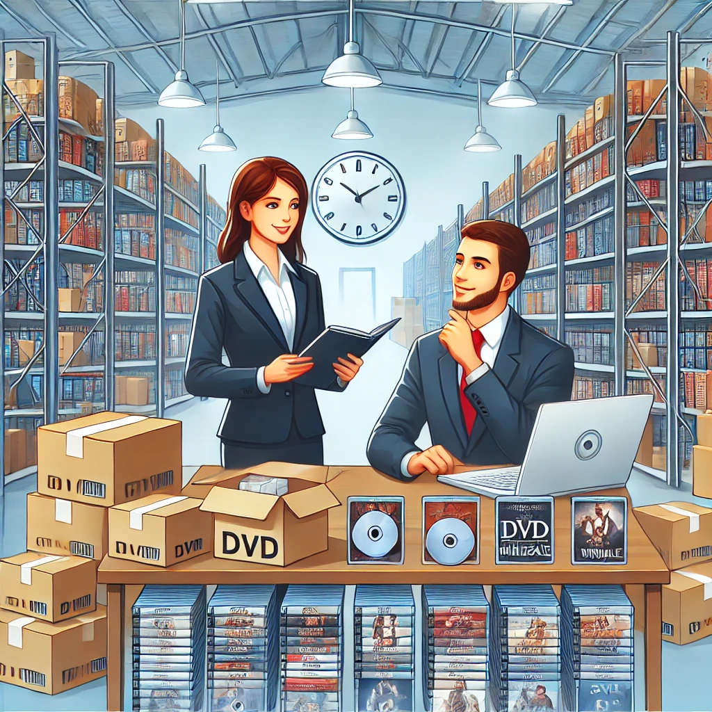 DALL·E 2024-11-24 17.24.47 - A professional scene illustrating the key features of a DVD wholesale service, showcasing a customer and a staff member discussing inventory in a mode