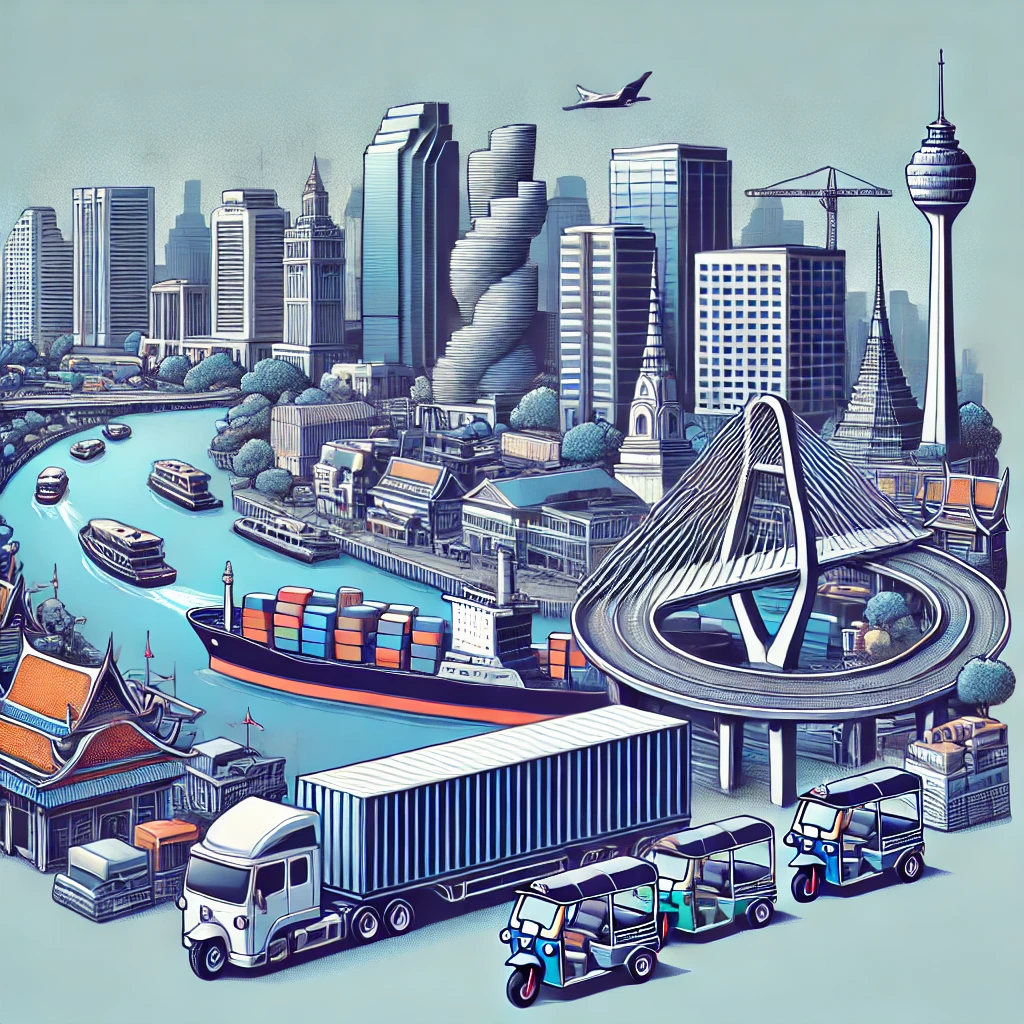 DALL·E 2024-12-11 20.45.39 - An illustration of a modern cityscape of Bangkok with its iconic landmarks like the Baiyoke Tower and Chao Phraya River. The scene features industrial