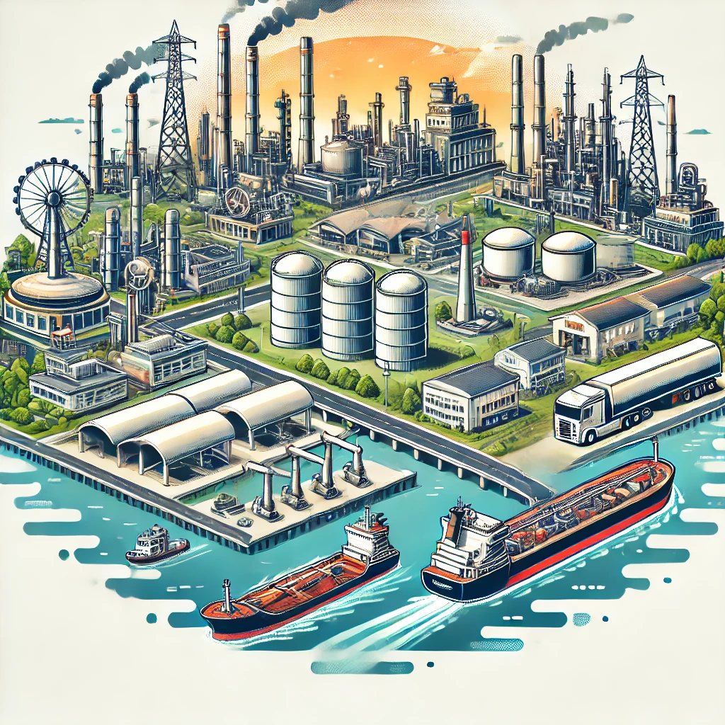 DALL·E 2024-12-11 20.47.12 - An illustration of Rayong, Thailand, featuring its industrial zones with large factories, oil refineries, and trucks transporting goods. Include coast