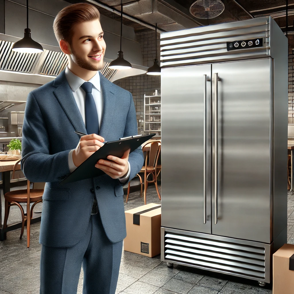 DALL·E 2024-12-20 16.09.43 - A realistic and professional scene showing an on-site assessment for restaurant equipment buyback. The image features a friendly staff member in a bus