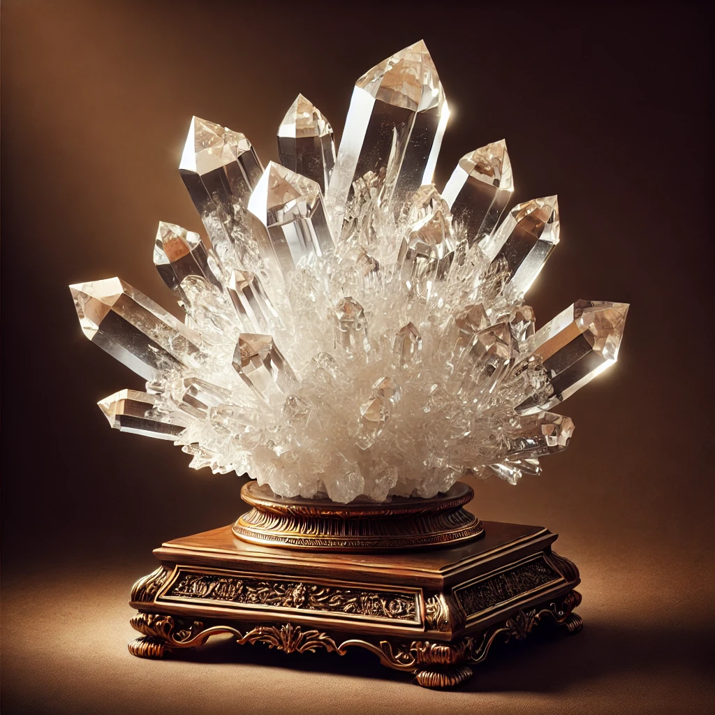 DALL·E 2025-03-13 12.55.02 - An exquisite decorative quartz crystal cluster placed on a luxurious wooden base. The quartz should be large, clear, and highly detailed with intricat