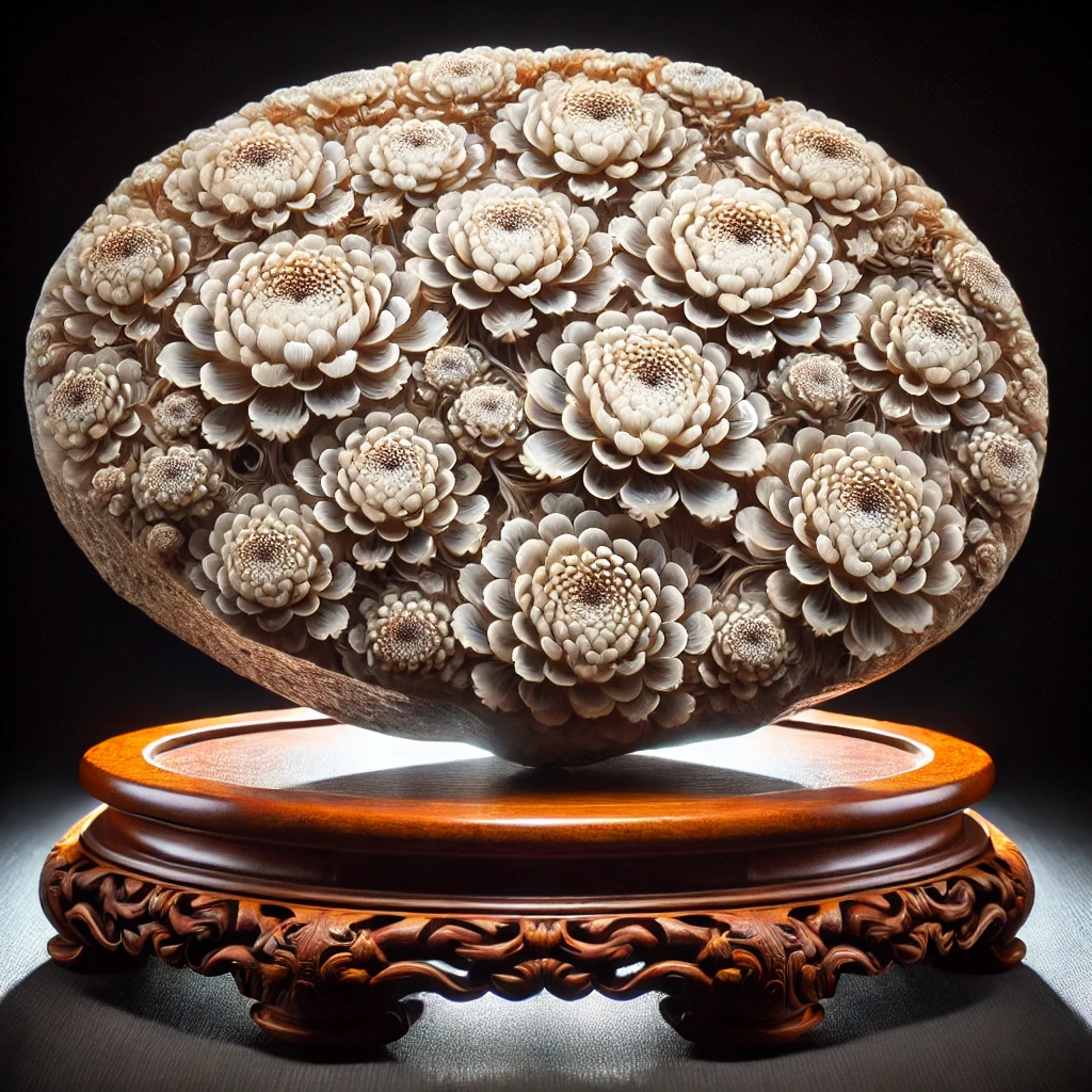DALL·E 2025-03-13 13.06.44 - A stunning and rare Kikka-seki (Chrysanthemum Stone) display piece with naturally formed floral patterns. The stone should be placed on a beautifully