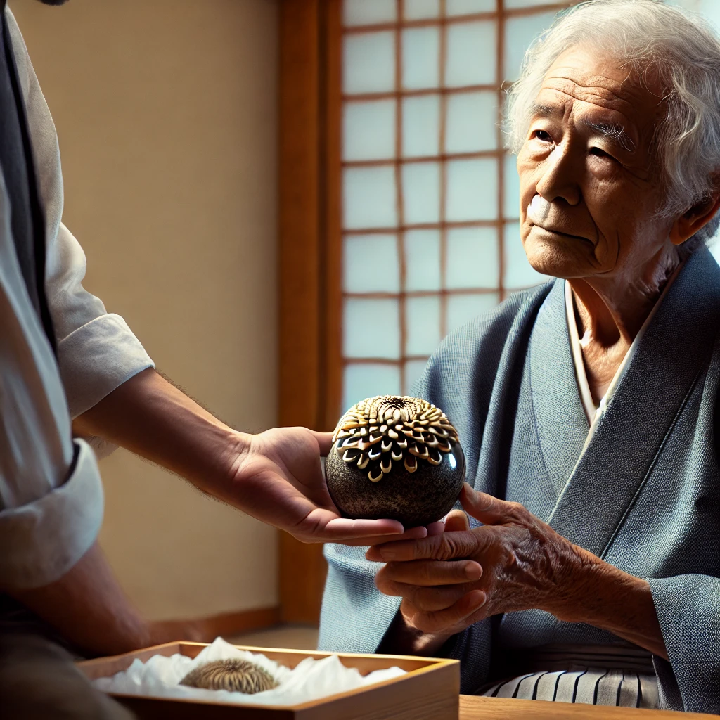 DALL·E 2025-03-13 13.09.04 - An elderly man in a traditional-style room, carefully handing over a Chrysanthemum Stone (Kikka-seki) to a professional appraiser. He looks content an