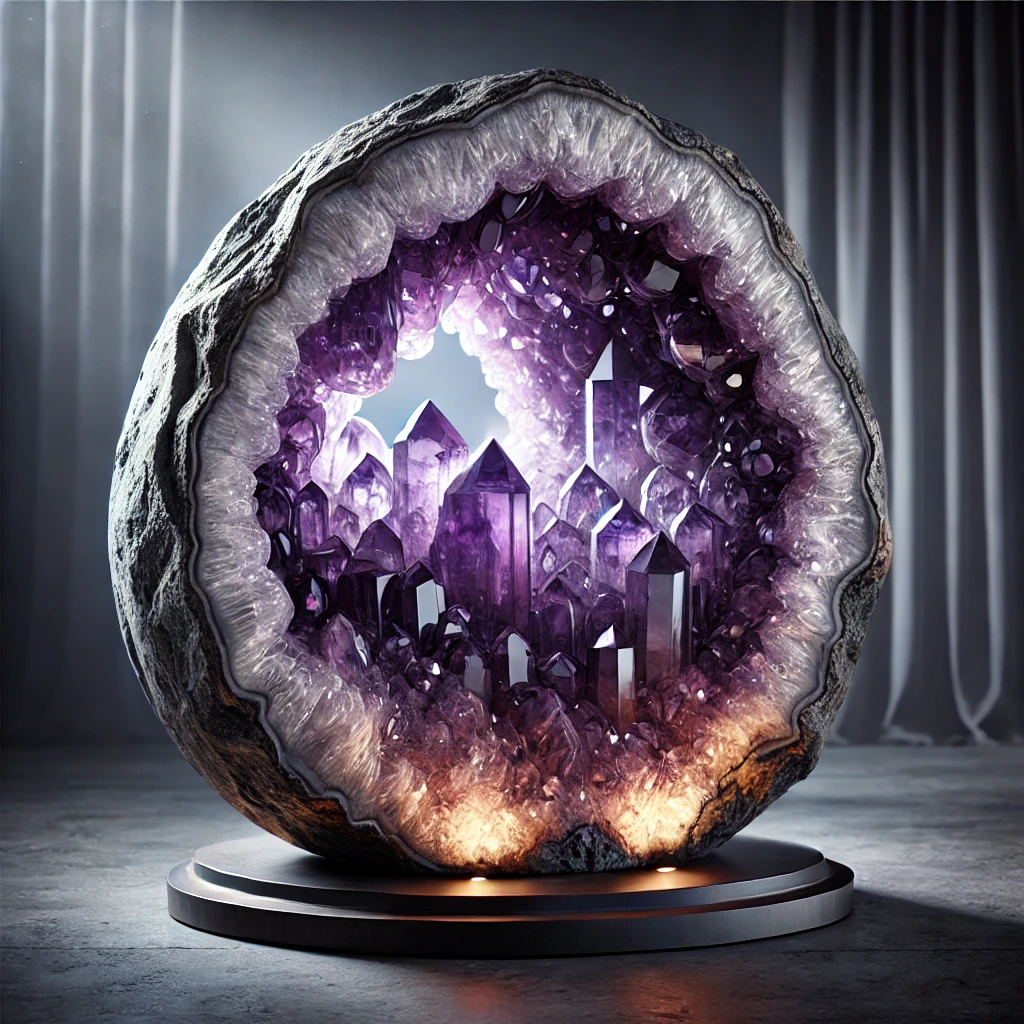 DALL·E 2025-03-13 13.10.58 - A luxurious and high-value amethyst dome geode with deep purple crystals inside. The geode should be large, with a natural rough exterior and a polish