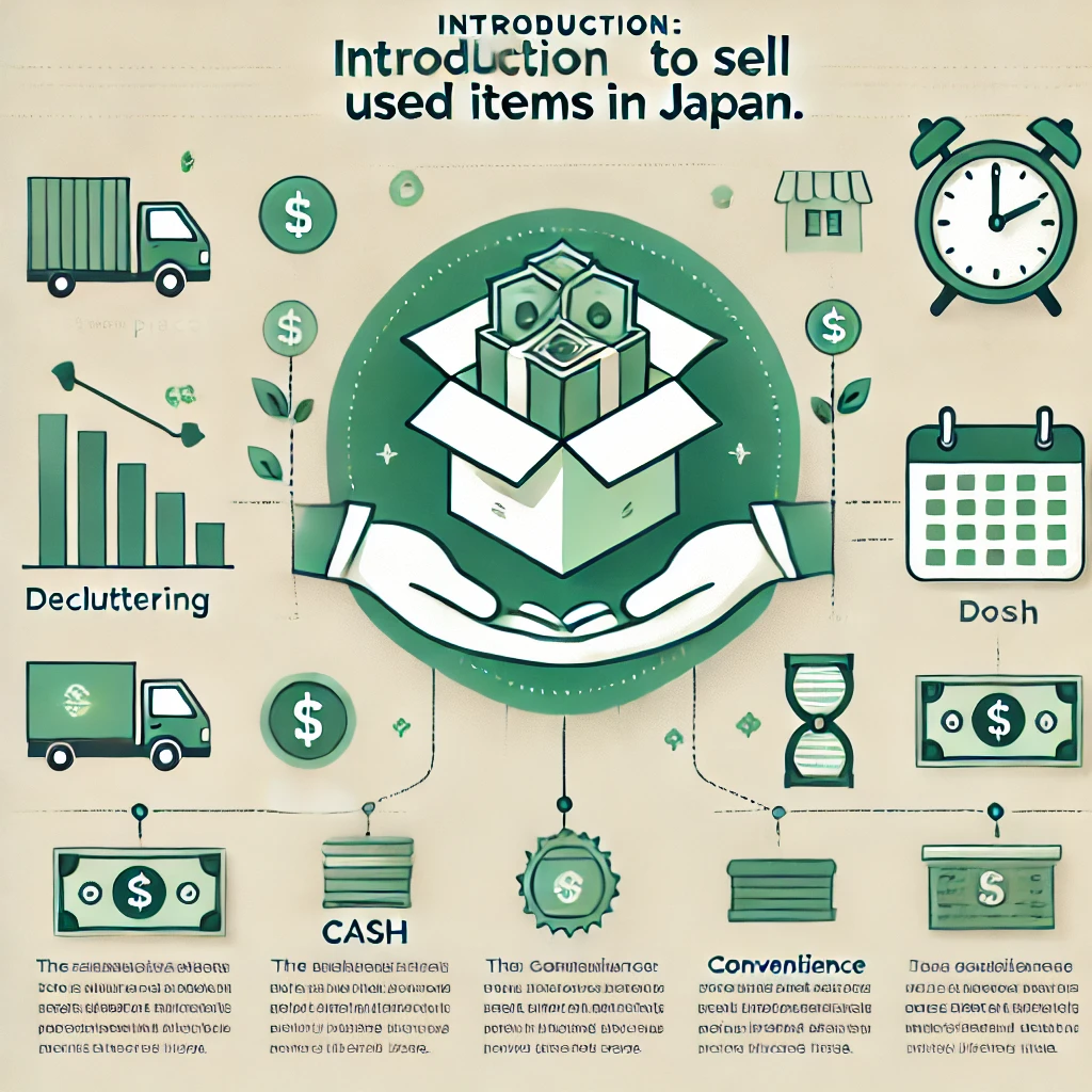 DALL·E 2025-01-03 15.02.28 - An inviting and clean infographic-like image titled 'Introduction_ Best Place to Sell Used Items in Japan.' The design includes icons representing dec