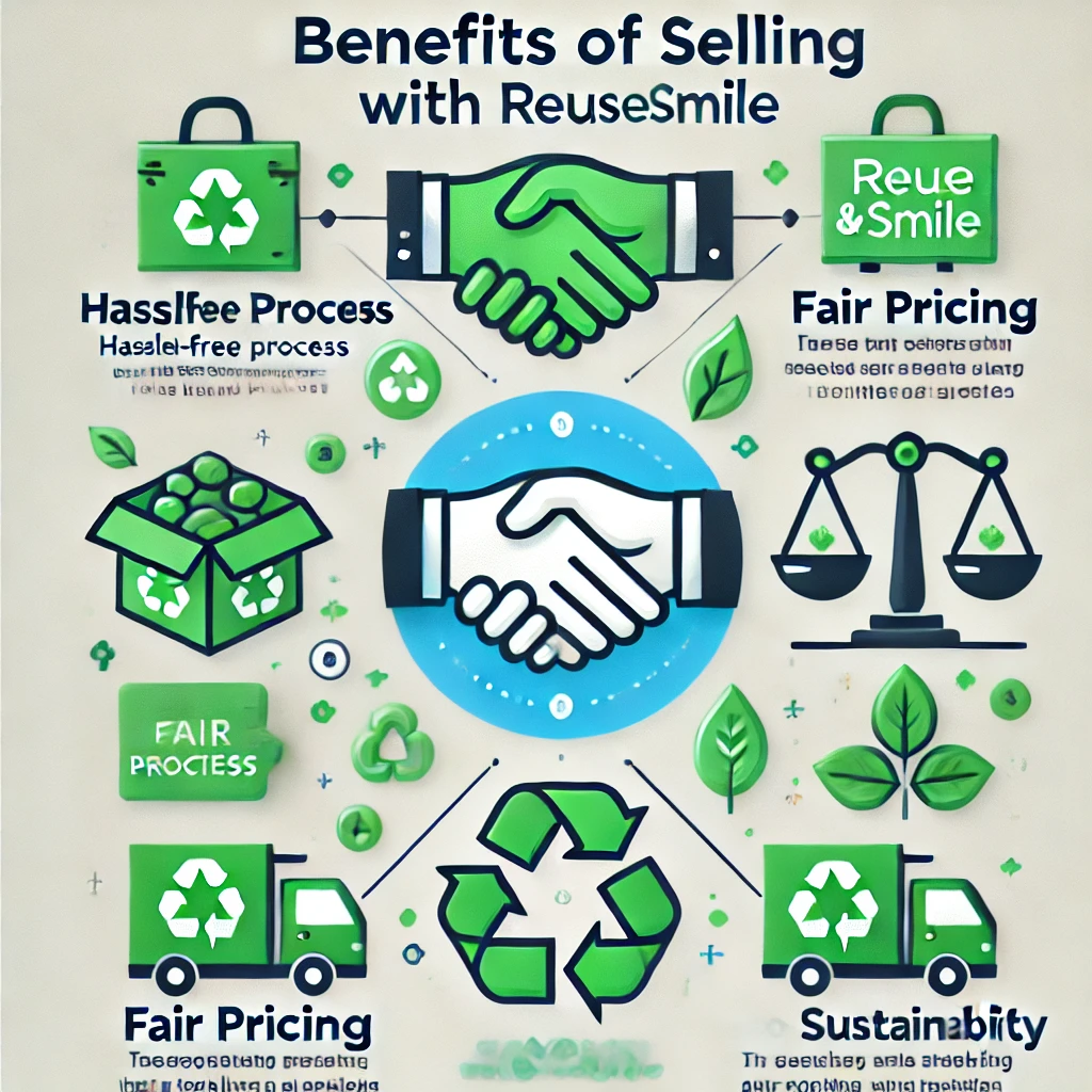 DALL·E 2025-01-03 15.02.35 - A modern and friendly infographic titled 'Benefits of Selling with ReuseSmile.' Includes icons for hassle-free process (handshake), fair pricing (scal