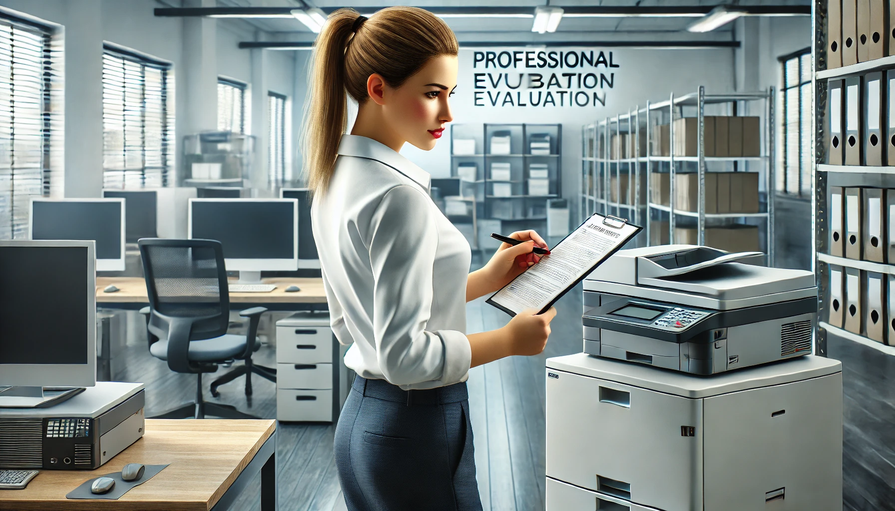 DALL·E 2025-03-21 11.07.34 - A realistic image of a professionally dressed female worker, wearing business attire, checking and noting down the condition of office equipment such
