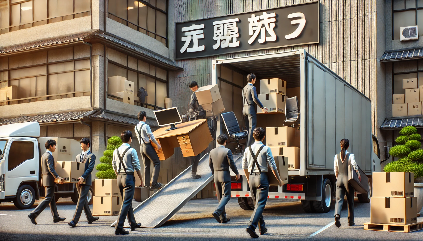 DALL·E 2025-03-21 14.39.05 - A realistic, business-like scene showing staff members actively engaged in office relocation work in Japan. Workers in uniforms are carrying desks, bo